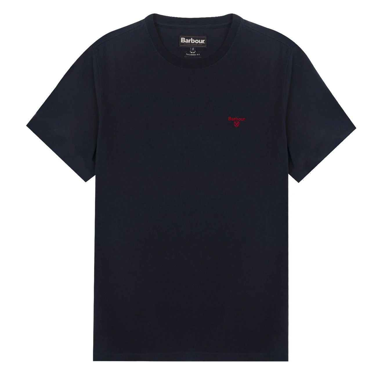 It features a classic finely ribbed crew neck and a straight hem for a timeless look. To the left chest is an embroidered brand logo accompanied by the Barbour name.
