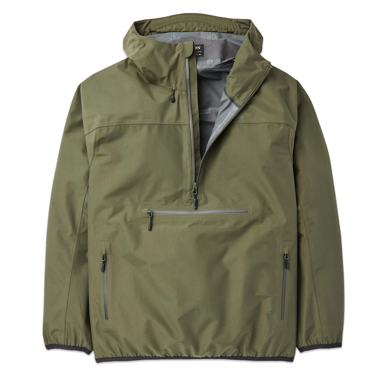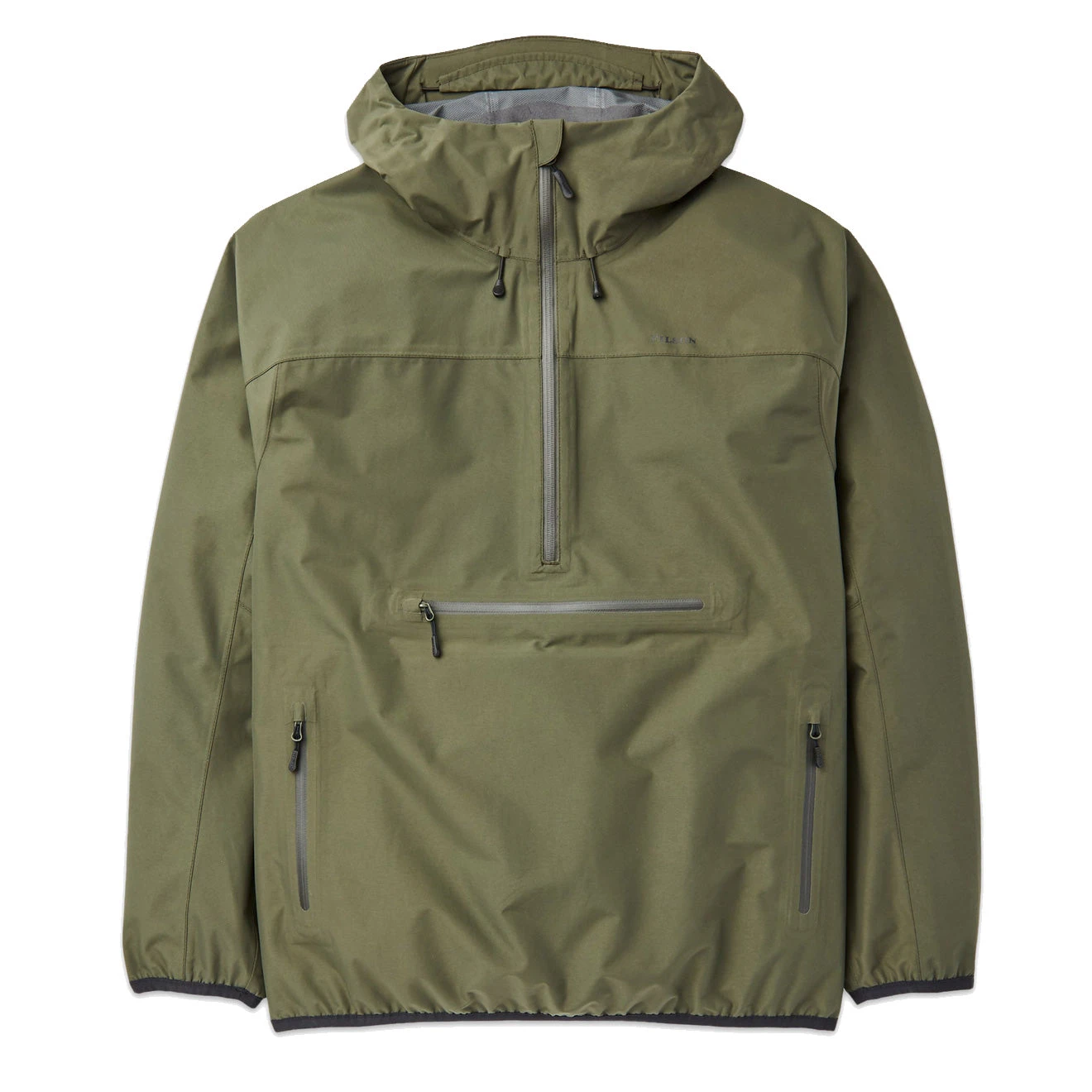 Swiftwater Rain Pullover is a half zip version of Filson’s most popular waterproof jacket, that will keep you dry when the foul weather hits. Constructed from 2.5 layer waterproof/breathable fabric with a laminated waterproof membrane and interior printed mesh grid to add durability whilst keeping the weight down. The jacket can be stowed in the centre chest pocket so its ready ready to go whenever it rains. Front kangaroo hand pockets with YKK® AquaGuard zippers to keep the rain out. Half-zip front closure with interior storm flap and micro-fleece backed chin guard. Fixed hood with 2-way adjustable drawcord and structured brim. Finished with stretch binding to cuffs and hem to keep the weather out.