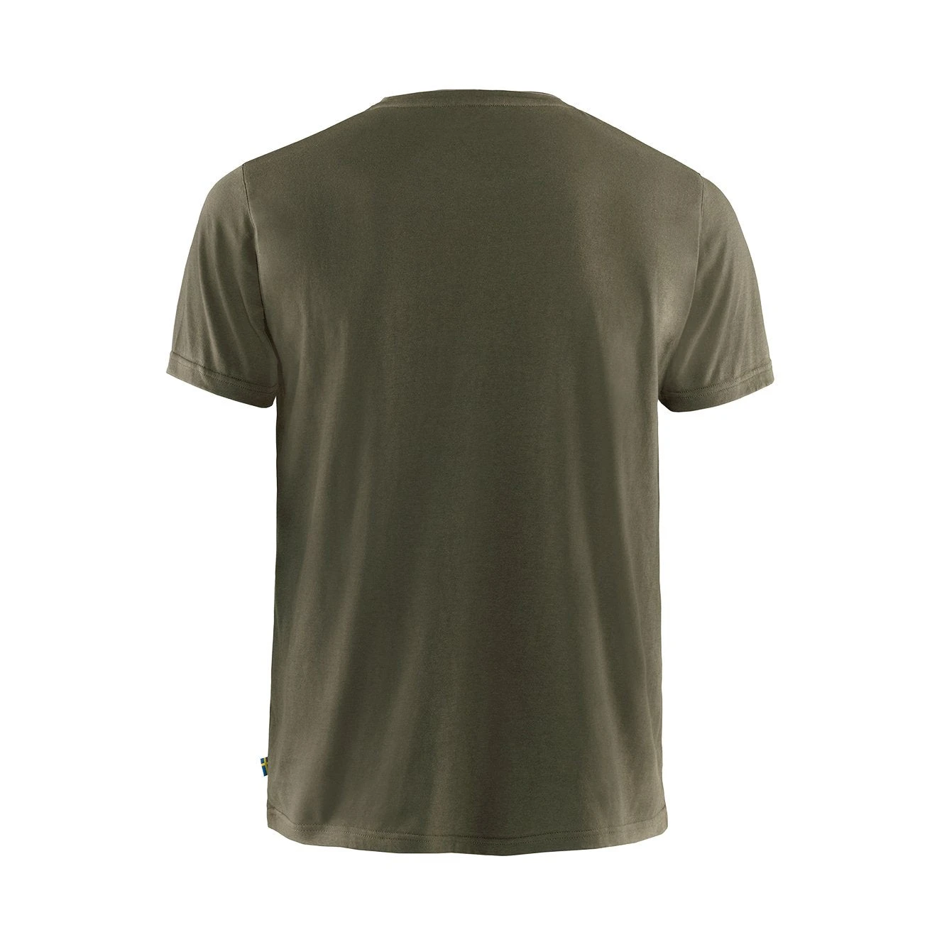 The Fjallraven Logo T-Shirt in Dark Olive is crafted from organic cotton and recycled polyester making a sustainable jersey knit. Quick drying and wicks away moisture making it ideal for any summer wardrobe. Finished with a large Fjallraven logo.