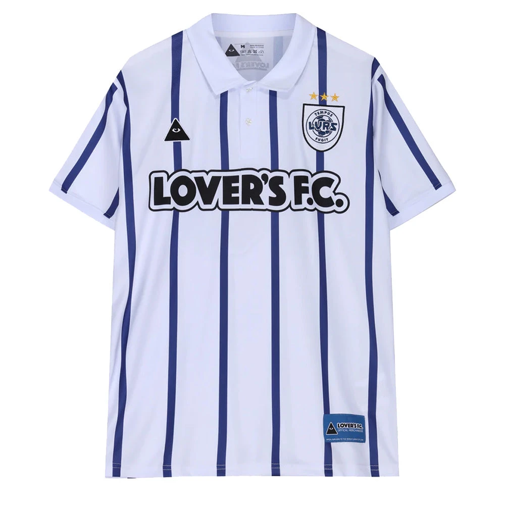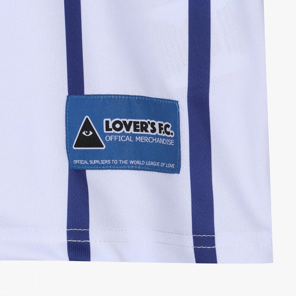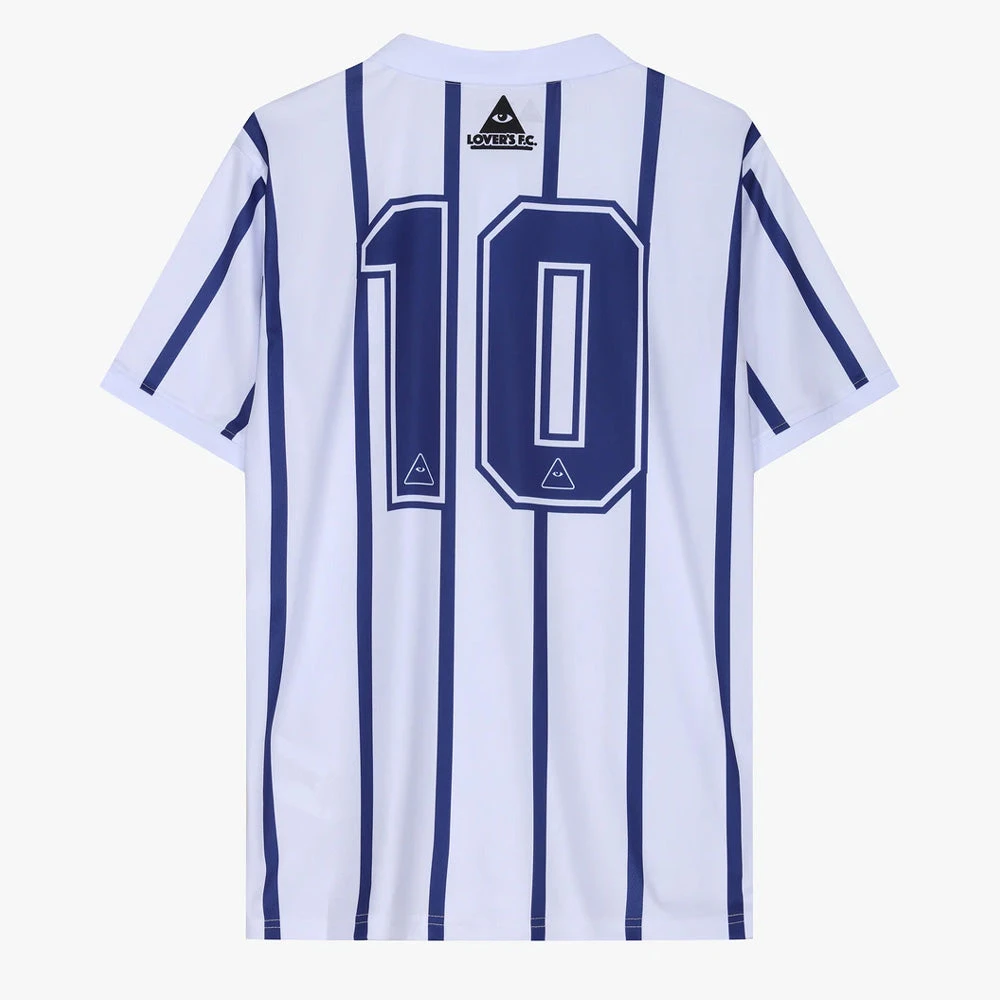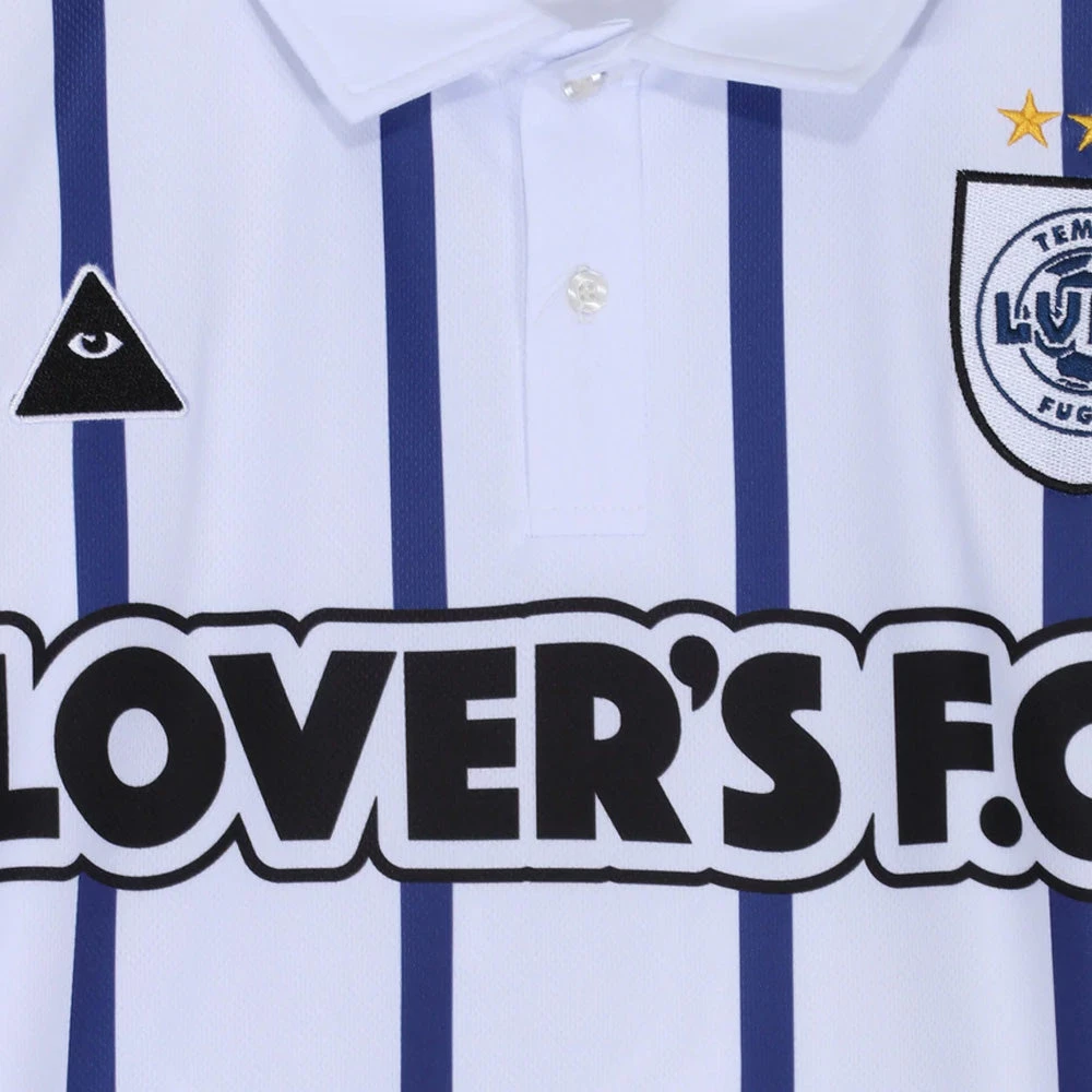 The Lovers FC Footy Shirt features a classic button up collar, short sleeves and a candy stripe print.