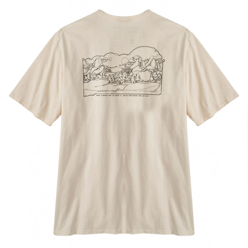 The Patagonia Lost and Found graphic celebrates a Jocelyn Slack illustration that we printed in an early Great Pacific Iron Works (later called Patagonia) catalog. Slack is credited with designing the Patagonia logo, among many other designs. “Leave it better than you found it and be found better than you left” reminds us all to steward the spaces that steward us. The artwork is screen-printed on a tee made of 100% organic cotton fabric. Because this T-shirt is made with organic cotton, it uses 84% less water and creates 16% less CO2 than a conventional cotton T-shirt. Fair Trade Certified⢠sewn.