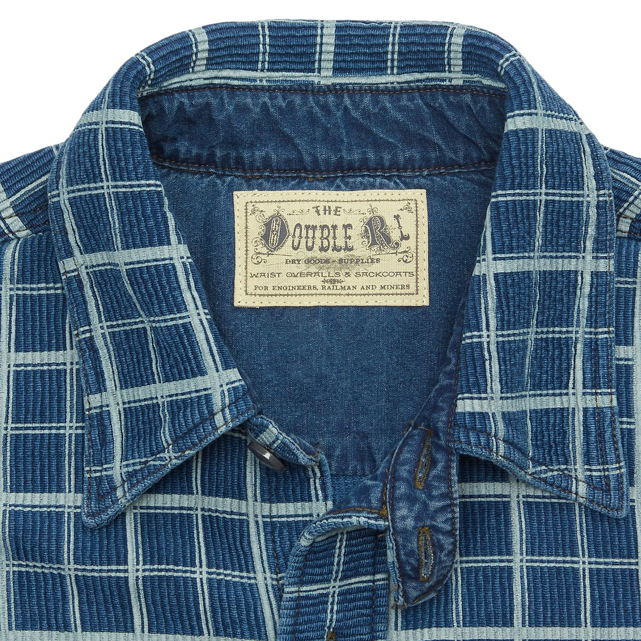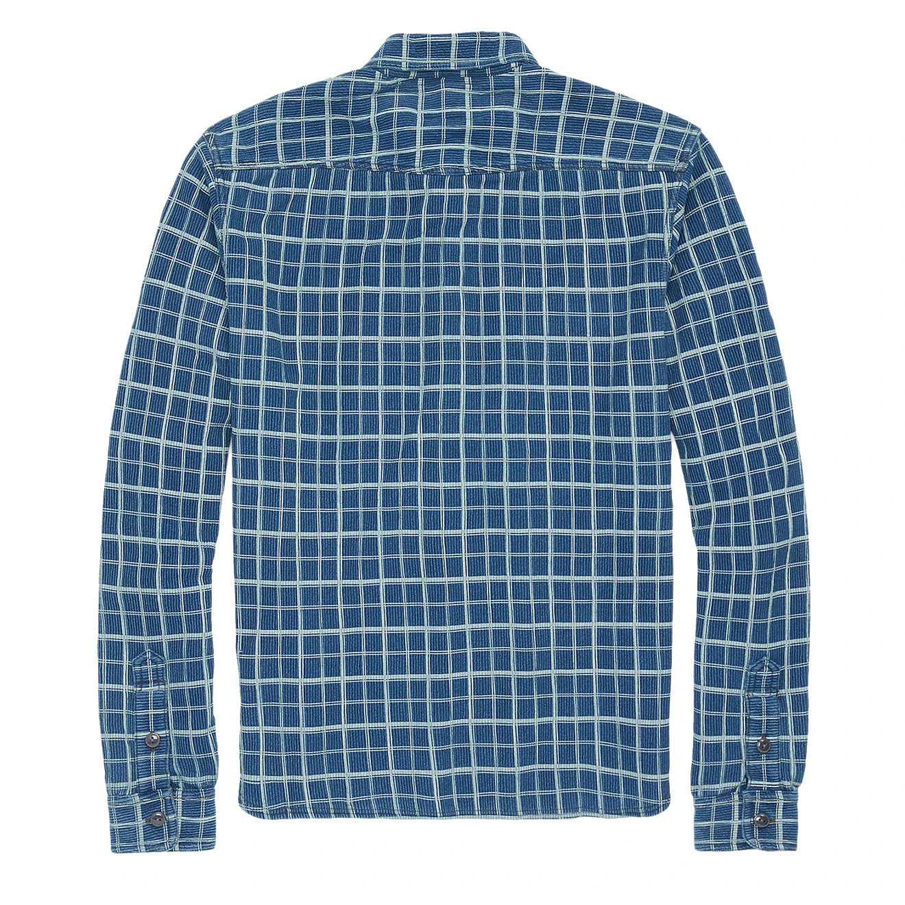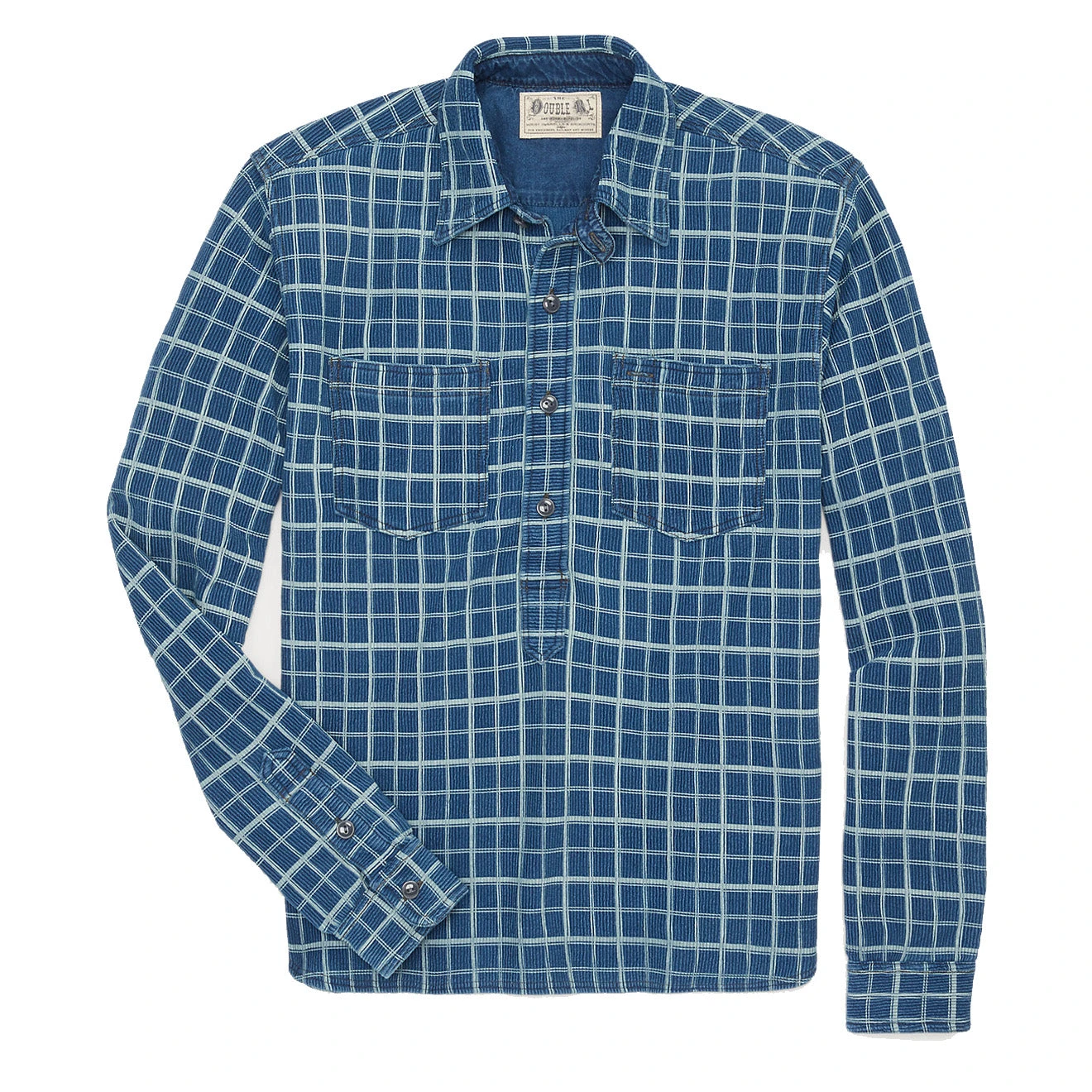 Made with rib-knit cotton jersey that is dyed with true indigo and pigment-printed with a checked pattern. Buttoned throat latch and half-placket. Washed for added softness.