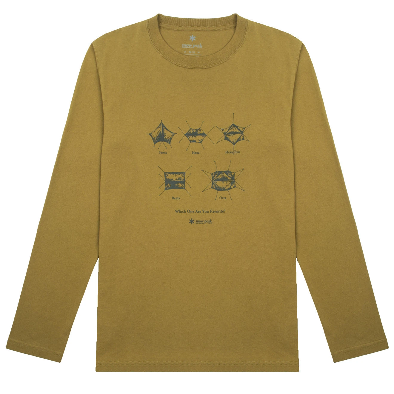 The Snow Peak SP Tarp Tee features a graphic print showcasing Snow Peak’s classic tarps.